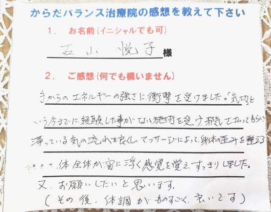 また、気功施術を受け続ける事により、物事をプラス思考で視野を広く取れる物事の見方が出来るようになる為、精神的安定と精神的強さが増し、物事にあまり執着しなくなり、ストレスをあまり感じずに日常生活を過ごす事が出来てくるという他の施術では得られない大きなメリットも当治療院の気功施術の特徴です。